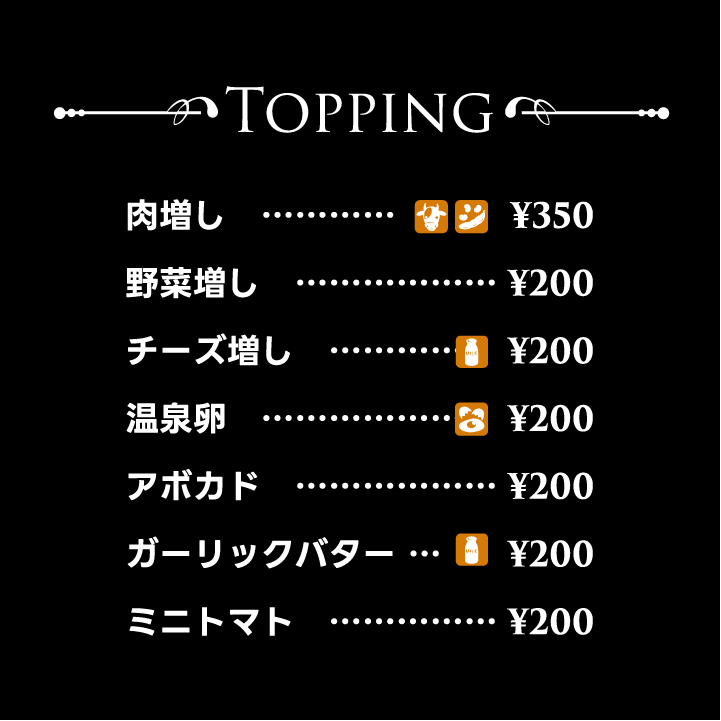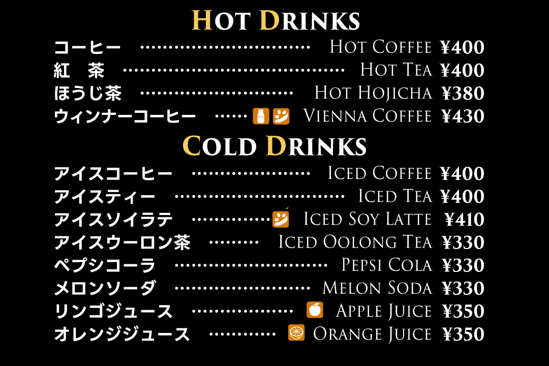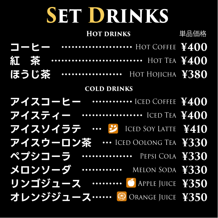 ※ 表記はすべて税込価格となり、「店内でのお食事」と「お持ち帰り」でどちらも同一の税込価格です。(税抜価格は異なります) ※ 店舗およびデリバリーでは価格が異なります。 ※ 店舗によりお取り扱いのない商品がございます。※ アレルゲンは、特定原材料8品目と特定原材料に準ずるもの20品目を対象 ※ アレルギー物質の完全除去に対応したサービスではございません。ご注意ください。 ※ 画像はイメージです。